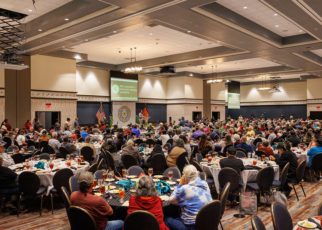 Hundreds of Cherokee speakers attended the event to visit in their Native language, listen to performances in Cherokee, and learn from Cherokee Nation leaders and language speakers about the nation’s language projects.