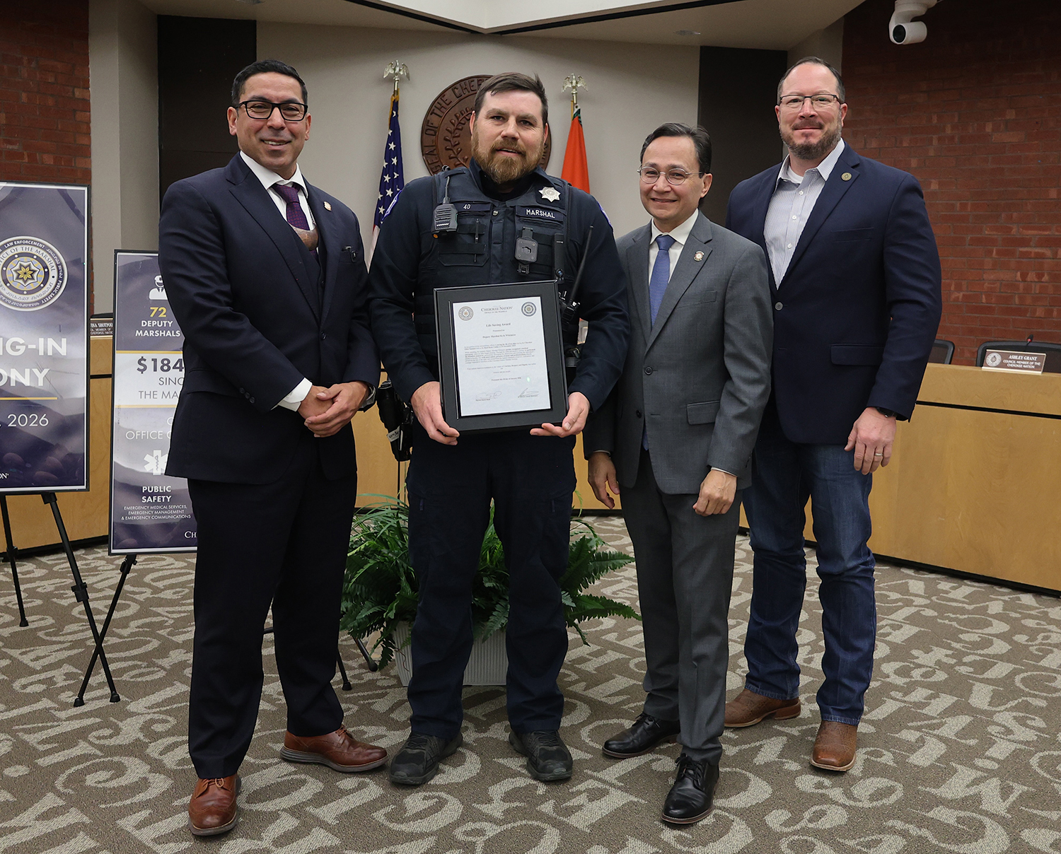 Also during the ceremony, three Deputy Marshals received the Cherokee Nation Lifesaving Award, presented by Marshal Mead, Chief Hoskin, and Deputy Chief Warner.