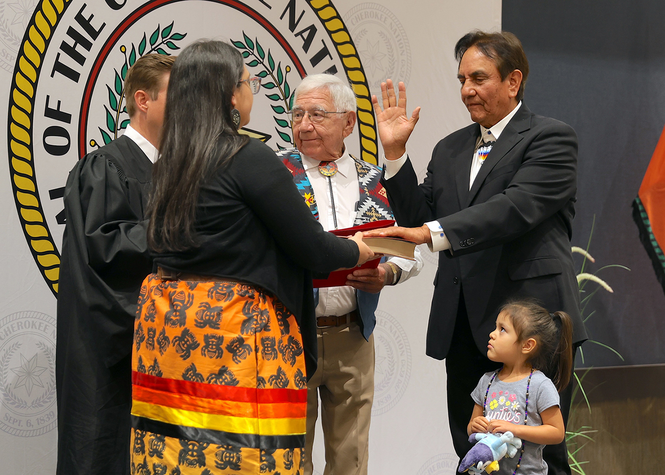 As part of the speakers gathering, Special Envoy for Language Preservation and International Affairs Joe Byrd was also sworn in for a new term by District Judge Luke Barteaux with help from Cherokee speaker DJ McCarter. Special Envoy Byrd was first named to the role by Chief Hoskin and Deputy Chief Warner in 2021. His oath was administered in the Cherokee language.