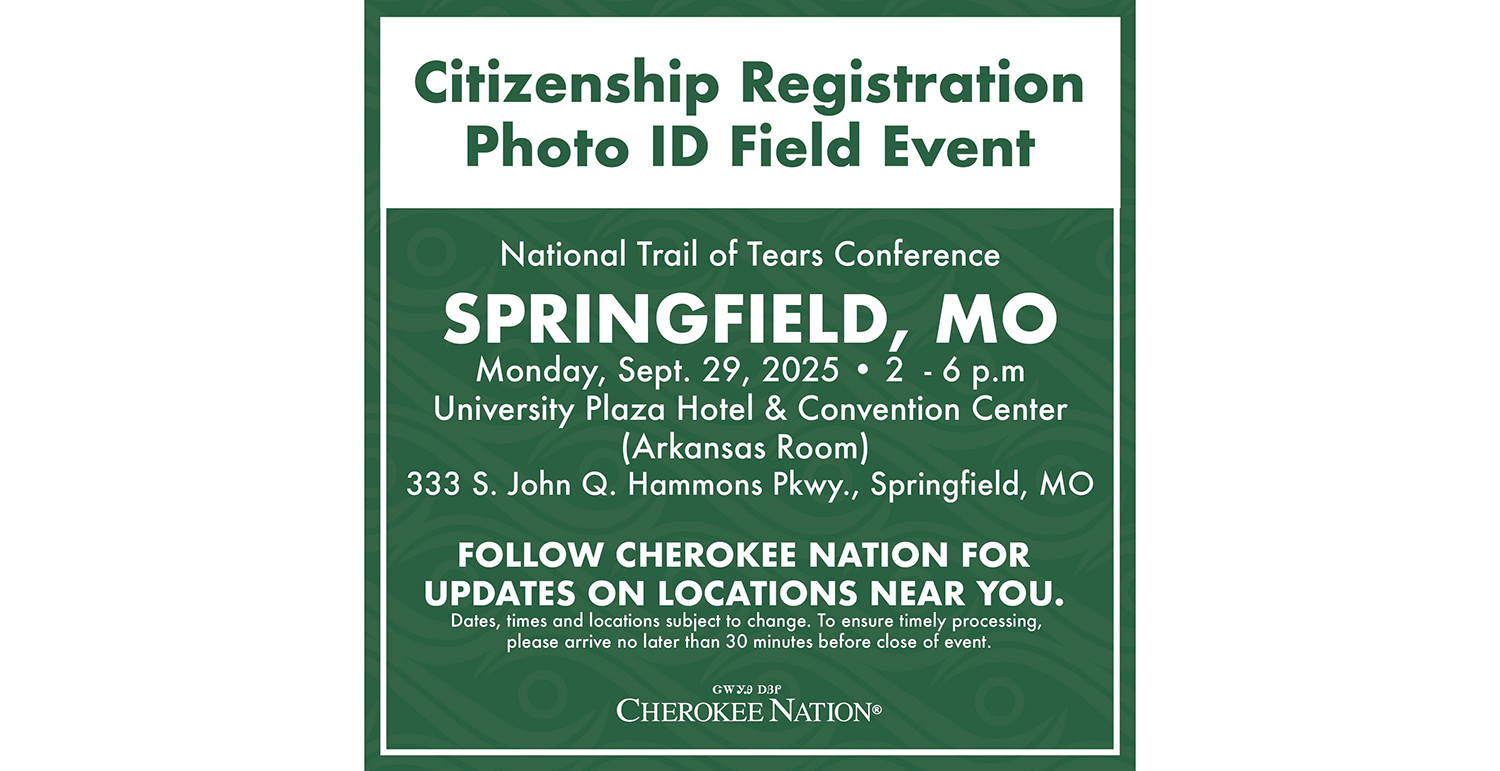 Cherokee Nation is also hosting a Citizenship Registration & Photo ID Field Event from 2 p.m. – 6 p.m. at the University Plaza Hotel & Convention Center. Tribal Registration will be on site to issue new photo IDs or replacements.