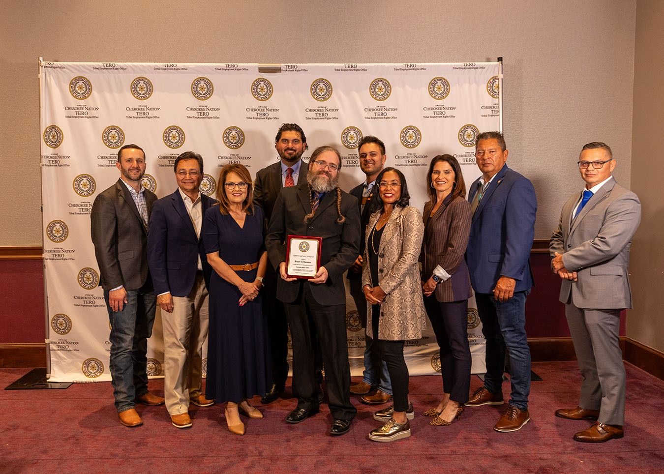 TERO Appreciation Award (L-R): Bryan Crittenden was recognized with the TERO Appreciation Award. Pictured: Deputy Secretary of State Canaan Duncan, Principal Chief Chuck Hoskin Jr., District 3 Councilor Lisa Hall, District 14 Councilor Kevin Easley Jr., Bryan Crittenden, District 8 Councilor Codey Poindexter, Secretary of State Shella Bowlin, District 11 Councilor Kendra McGeady, Speaker of the Council Mike Shambaugh and TERO Manager Larry Vance.