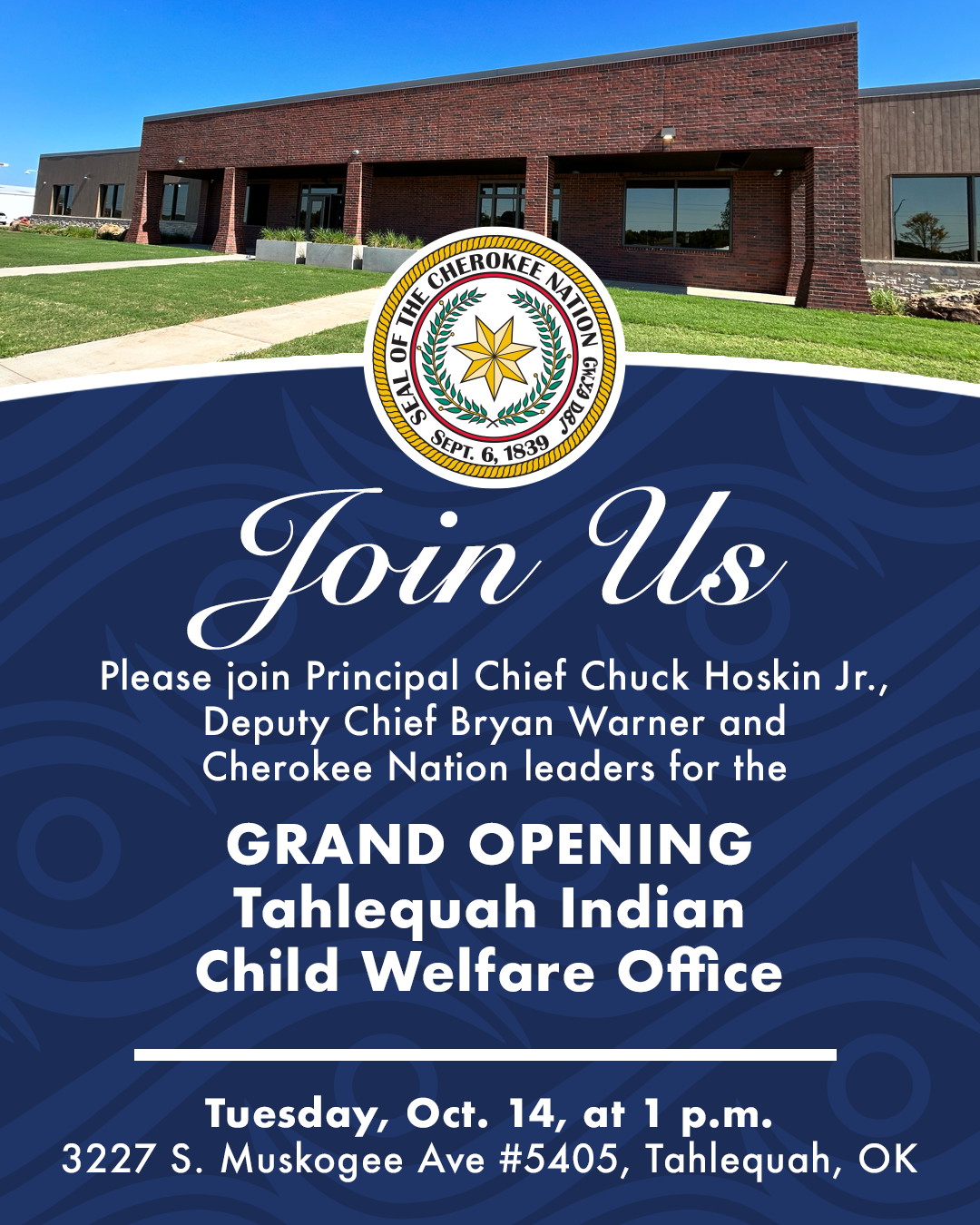 TAHLEQUAH, Okla. — Cherokee Nation Principal Chief Chuck Hoskin Jr. and other Cherokee Nation leaders will celebrate the grand opening of the new Cherokee Nation Indian Child Welfare building in Tahlequah. The new ICW office location was previously a Means Furniture store, and the construction project was completed in under two years.